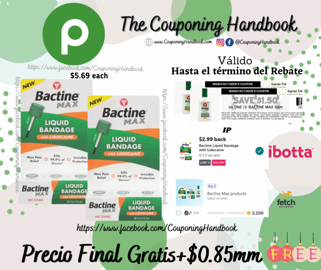 Compra 02 Bactine Max Liquid Bandage ($5.69 each), entregamos 02 IP de $1.50/1 bactine max item…., el cual lo puedes imprimir en el siguiente enlace 👉👉👉👉 (Coupons); Pagaremos $8.38 por los 02 productos.