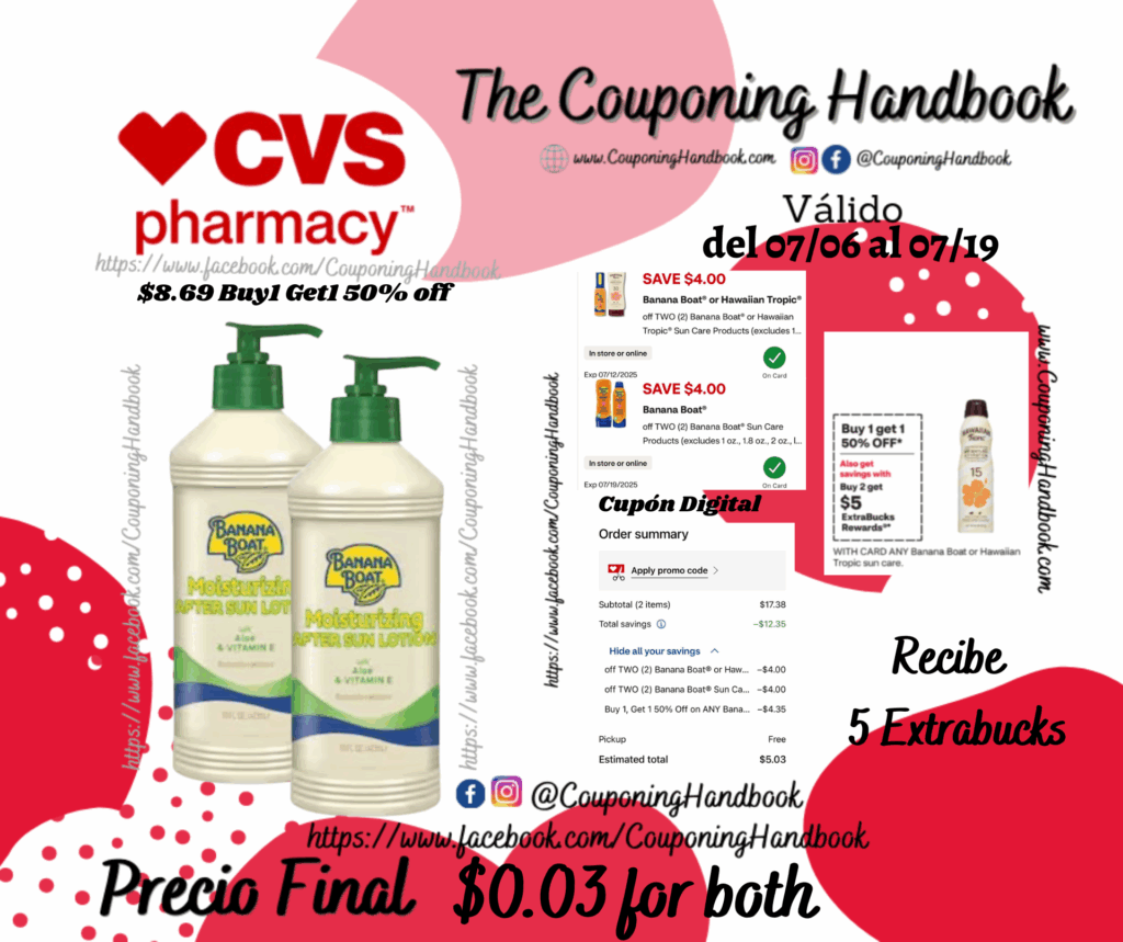 Toma 02 Banana Boat Moisturizing Aloe After Sun Lotion, 16 OZ ($8.69 Buy1 Get1 50% off), clipeamos los 02 cupones digitales de $4/2 Banana Boat or hawaiian tropic… y $4/2 Banana Boat…..; pagarás $5.03 por los 02 productos pero nos devolverán $5 Extrabucks, quedando nuestra compra en $0.03 por ambos productos.