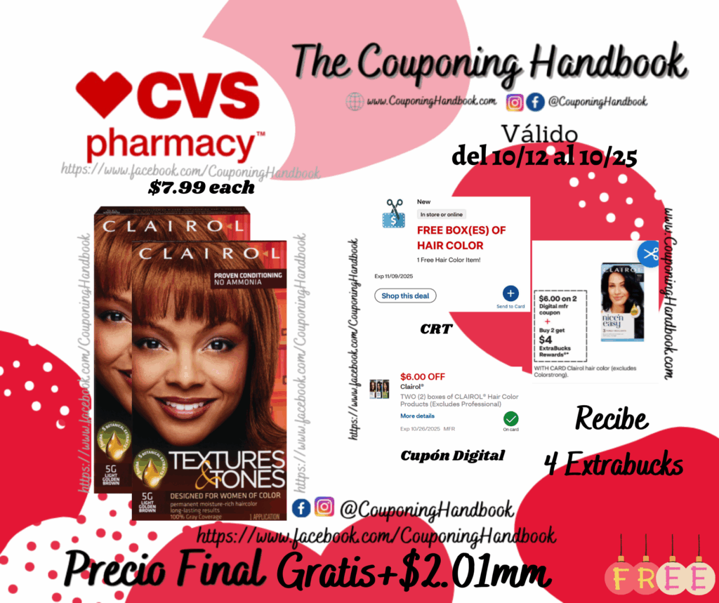 Compra 02 Clairol Professional Textures & Tones Hair Color ($7.99 each), clipeamos el CRT de Free Box(es) off hair color…, también clipeamos el cupón digital de $6/2 boxes of CLAIROL® Hair Color Products (Excludes Professional)…..; pagaremos $1.99 por ambos productos pero nos regresarán $4 extrabucks, quedando nuestra compra completamente Gratis!!! y con una  ganancia de $2.01