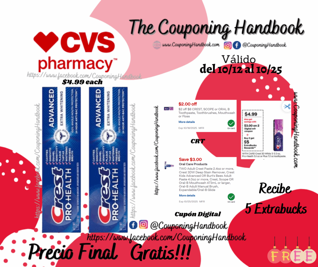 Toma 02 Crest Pro-Health Advanced Extra Whitening Fluoride Toothpaste, 5.1 OZ ($4.99 each), clipeamos el CRT de $2 off $8 CREST, SCOPE or ORAL B Toothpaste, Toothbrushes, Mouthwash or Floss…, también clipeamos el cupón digital de $3/2 Crest Paste 2.4oz or more, Crest 3DW Deep Stain Remover, Crest Kids Advanced OR Burt’s Bees Adult Paste 4.0oz or more, Crest, Scope OR Oral-B Mouthwash 473mL or larger…; Pagaremos $4. 98por los 02 productos pero nos devolverán $5 Extrabucks, quedándonos la compra después de los extrabucks completamente Gratis!!!