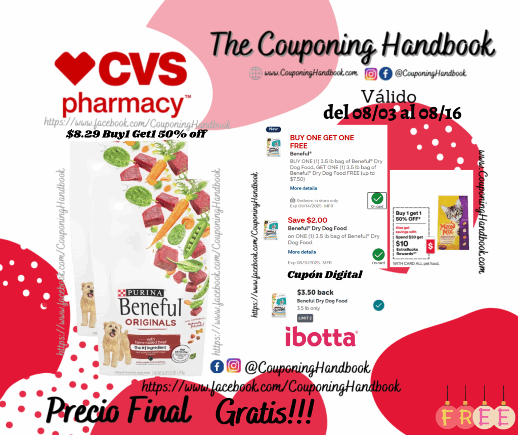 Compra 02 Dog Food & Treats Beneful Originals Dog Food, Real Beef, 3.5 lb ($8.29 Buy1 Get1 50% off), clipeamos los cupones digitales de: BUY ONE (1) 3.5 lb bag of Beneful® Dry Dog Food, GET ONE (1) 3.5 lb bag of Beneful® Dry Dog Food FREE (up to $7.50)… y $2/1 3.5 lb bag of Beneful® Dry Dog Food….; pagaremos $6.30 por los 02 productos.