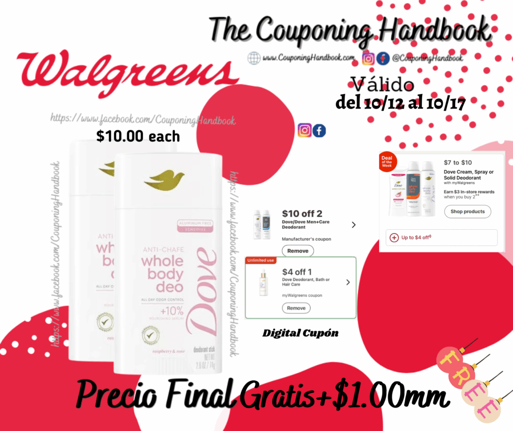 Compra 02 Dove Whole Body Deo Stick Raspberry & Rose, 2.6 oz ($10.00 each), clipea los cupones digitales de: $10/2 dove, dove men+care deodorant…. y $4 off 1 dove deodorant , bath or hair care (unlimited use)…..; pagarás $2.00 pero te devolverán $3.00 in store rewards (catalina), quedando tu compra completamente Gratis!!! y con una ganancia de $1.00 por ambos productos.