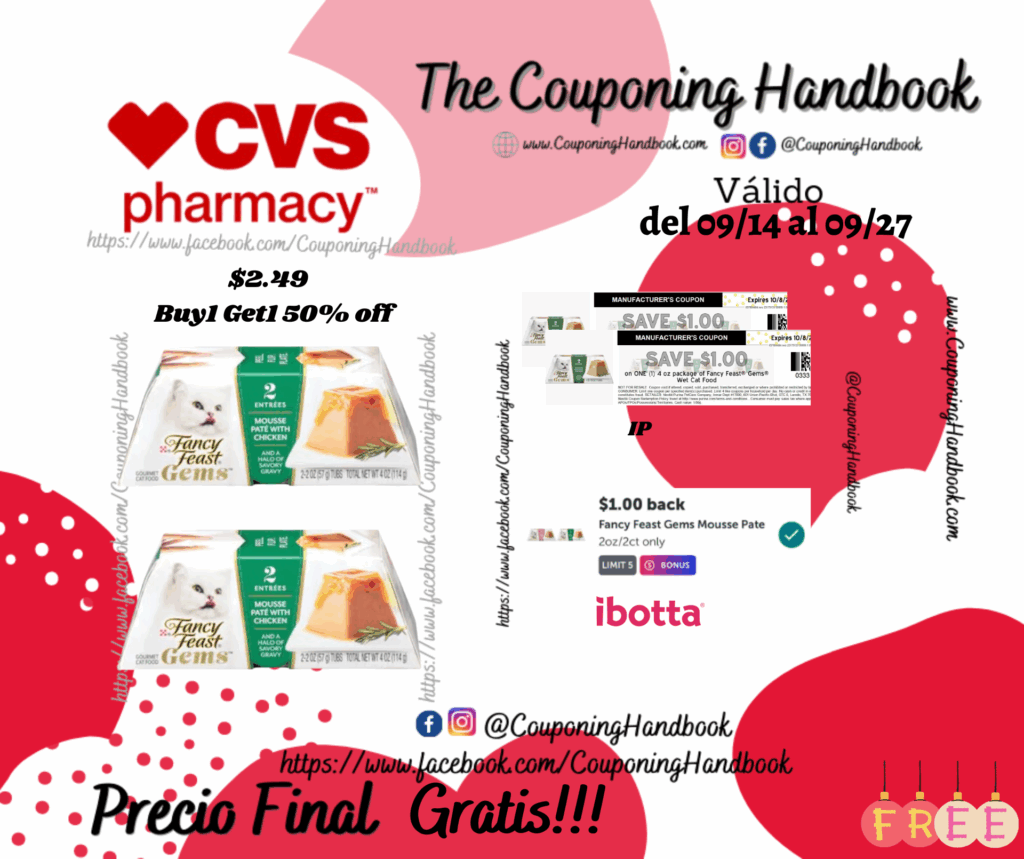Toma 02 Fancy Feast Gems 2oz/2ct ($2.49 Buy1 Get1 50% off), entregamos 02 IP de $1.00/1 4oz package of fancy fest gems wet cat food…., el cual lo puedes imprimir en el siguiente enlace