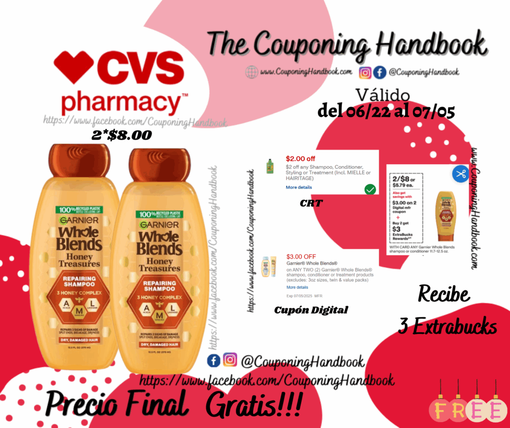 Compra 02 Garnier Whole Blends Honey Treasures Repairing Shampoo, 12.5 Ounces (2*$8.00), clipeamos el CRT de $2 off any shampoo, conditioner…, también clipeamos el cupón digital de $3/2 any Garnier® Whole Blends® shampoo, conditioner or treatment products (excludes: 3oz sizes, twin & value packs)…; pagaremos $3.00 por los 02 productos pero nos devolverán $3 Extrabucks, quedando nuestra compra después de los extrabucks completamente Gratis!!!
