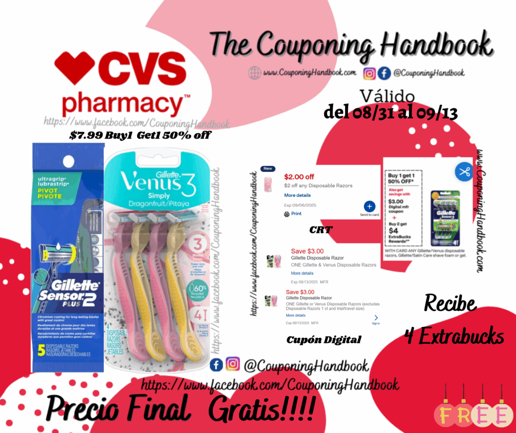 Compra 01 Gillette Sensor2 Plus Pivoting Head Men’s Disposable Razors, 5 CT ($7.99 Buy1 Get1 50% off) y 01 Gillette Venus Simply 3 3-Blade Disposable Razors, Dragonfruit, 4 CT ($7.99 Buy1 Get1 50% off), clipeamos el CRT de $2 off any Disposable Razors…, también clipeamos los cupones digitales de: $3/1 ONE Gillette & Venus Disposable Razors… y $3/1 Gillette or Venus Disposable Razors (excludes Disposable Razors 1 ct and trial/travel size)….; Pagarás $3.98 pero nos devolverán $4 extrabucks por comprar 02 productos, quedando la compra después de los extrabucks completamente Gratis!!!