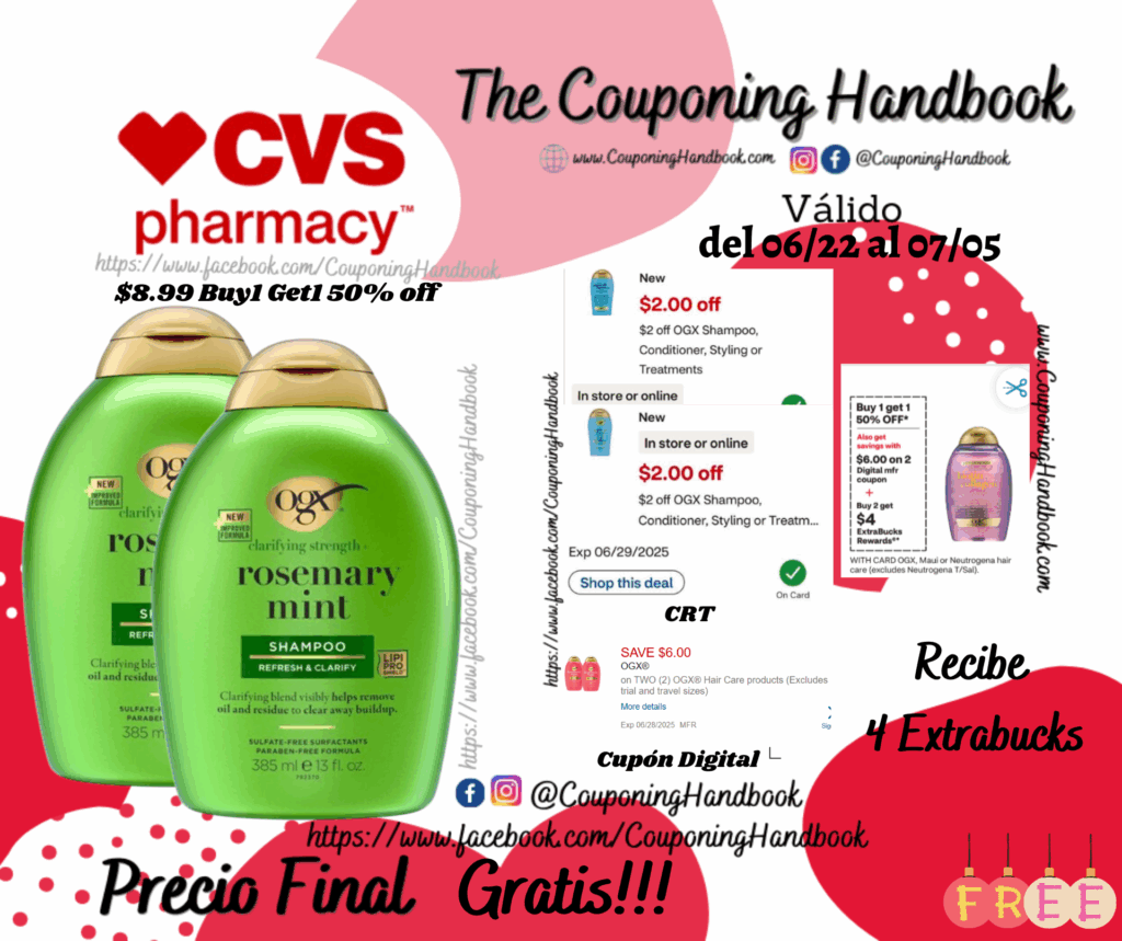 Compra 02 OGX Rosemary Mint Shampoo, 13 OZ ($8.99 Buy1 Get1 50% off), clipeamos los (02) CRT de $2 off OGX shampoo, conditioner……, también clipeamos el cupón digital de $6/2 any OGX hair products…; Pagaremos $3.48 por los 02 productos pero nos devolverá $4 Extrabucks, quedando la compra después de los extrabucks completamente Gratis!!! y con una pequeña ganancia de $0.52