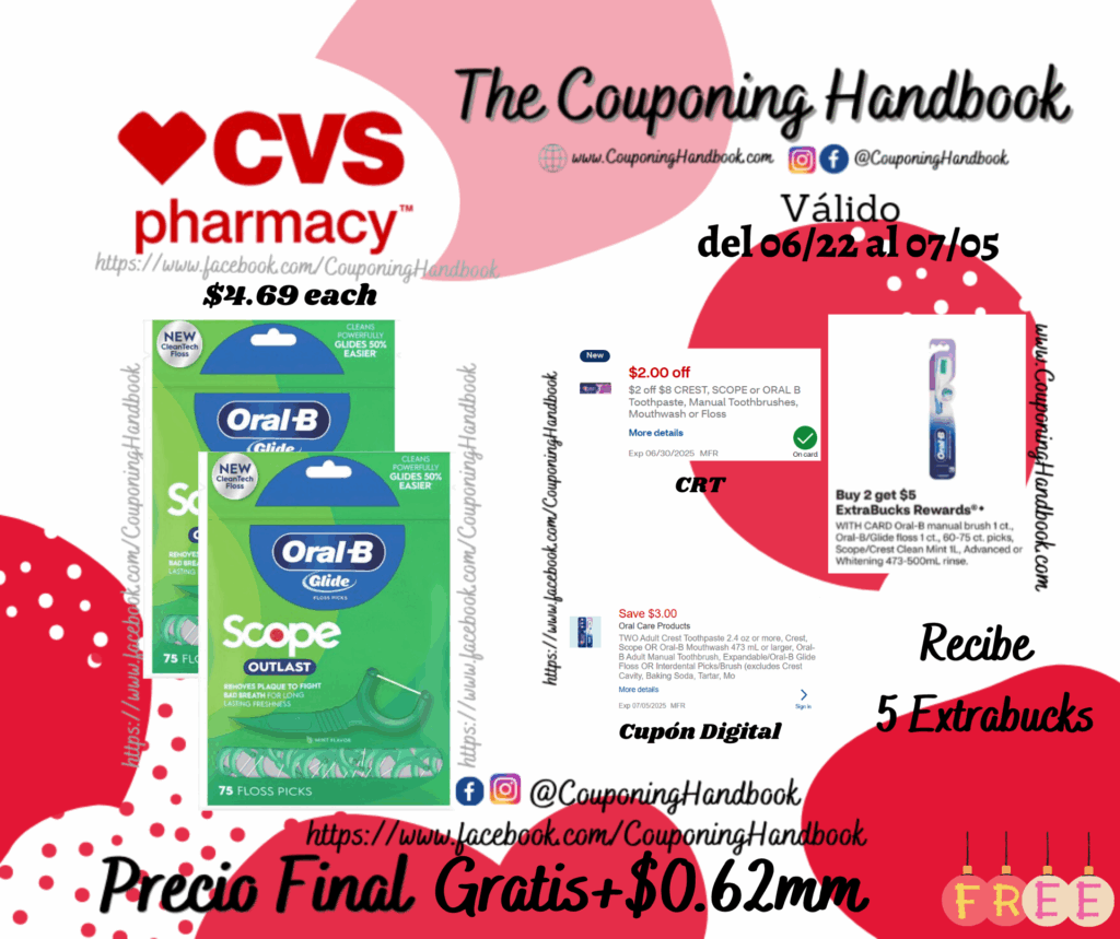 Compra 02 Oral-B Glide Scope Outlast Floss Picks, 75 CT ($4.69 each), clipeamos el CRT de $2 off $8 crest, scope or oral B…, también clipeamos el cupón digital de $3/2 Oral Care products.…; pagaremos $4.38 pero te devolverán $5 Extrabucks por comprar 2 productos, quedando nuestra compra completamente Gratis!!! y con una ganancia de $0.62
