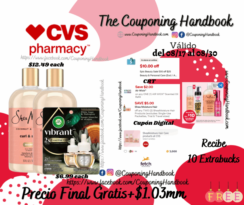 Toma 02 Shea Moisture Coconut & Hibiscus Curl & Shine Shampoo, 13 OZ ($12. 49each) y 01 Air Wick® Vibrant Scented Oil Refill, White Sage & Mahogany, 2 ct ($6.99 each), clipeamos el CRT de $10 off $25 beauty & personal care…., también clipeamos el cupones digitales de: $5/2 any SheaMoisture Hair Products…. y $2/1 AIR WICK® Scented Oil Refill….; Pagaremos $14.97 pero nos devolverán $10 Extrabucks por gastar $30 en productos, quedando nuestra compra después de los extrabucks en $4.97 por los 03 productos.