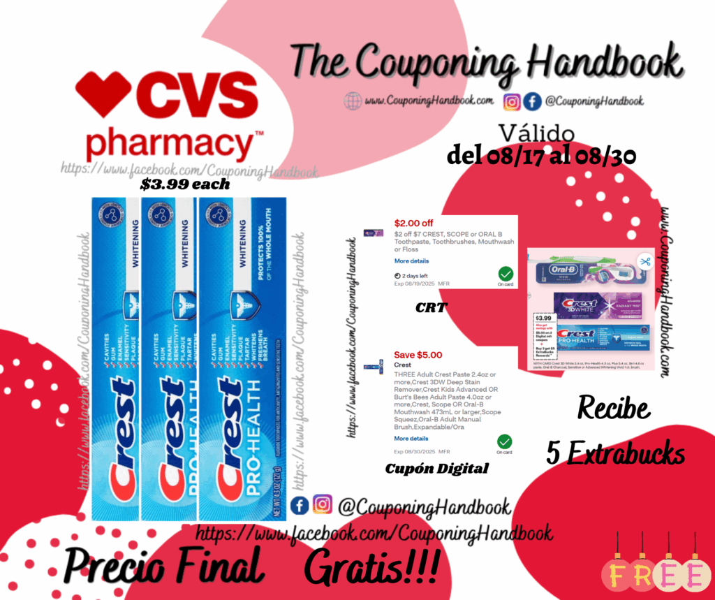 Toma 03 Crest Pro-Health Whitening Anticavity Fluoride Toothpaste, 4.3 OZ ($3.99 each), clipeamos el CRT de $2 off $7 CREST, SCOPE or ORAL B Toothpaste, Toothbrushes, Mouthwash or Floss….., también clipeamos el cupón digital de $5/3 THREE Adult Crest Paste 2.4oz or more,Crest 3DW Deep Stain Remover,Crest Kids Advanced OR Burt’s Bees Adult Paste 4.0oz or more,Crest, Scope OR Oral-B Mouthwash 473mL ….; Pagarás $4.97 por los 03 productos pero te devolverán $5.00 extrabucks, quedando tu compra después de los extrabucks completamente Gratis!!!