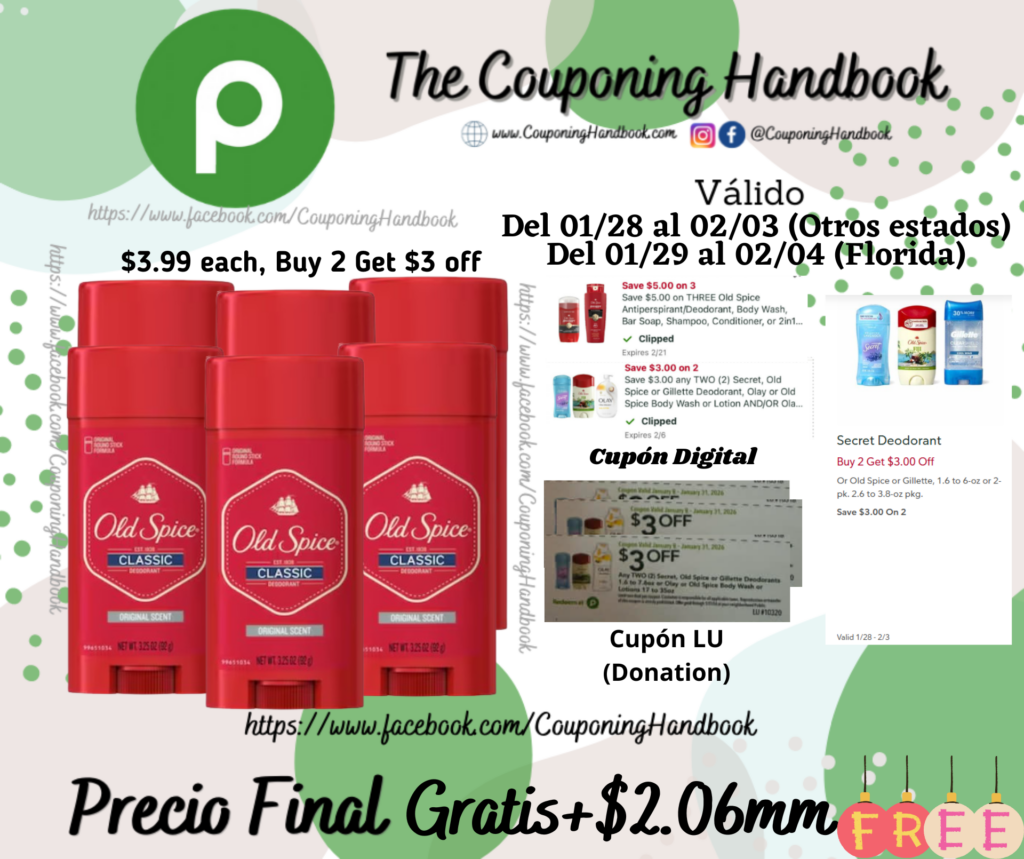 Compra 06 Old Spice Classic Original Scent Deodorant for Men, 3.25 oz ($3.99 each, Buy2 Get $3 off), clipeamos los cupones digitales de: $5/3 Old Spice Antiperspirant/Deodorant, Body Wash, Bar Soap, Shampoo, Conditioner, or 2in1… y $3/2 any Secret, Old Spice or Gillette Deodorant, Olay or Old Spice Body Wash or Lotion AND/OR Olay Bar Soap, también entregamos 03 Cupones LU de $3/2 any secret, old spice or gillette….. , por último la tienda nos descontará automáticamente $3 off por comprar 02 productos; Al aplicarse los cupones y el descuento nos llevaremos los 06 productos completamente Gratis!!! y con una ganancia de $2.06