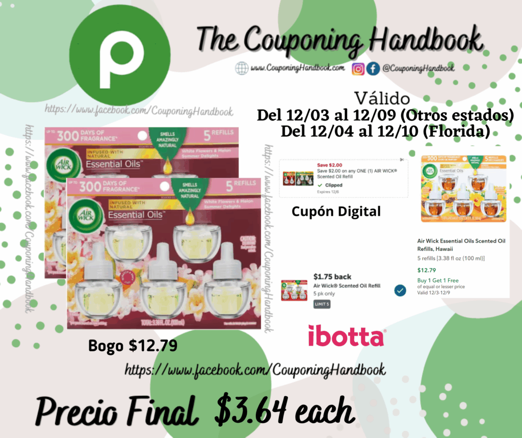 Toma 02 Air Wick Essential Oils Scented Oil Refills 5 refills (Bogo $12.79), clipeamos el cupón digital de $2/1 any AIR WICK® Scented Oil Refill….; Pagaremos $10.79 por los 02 productos.