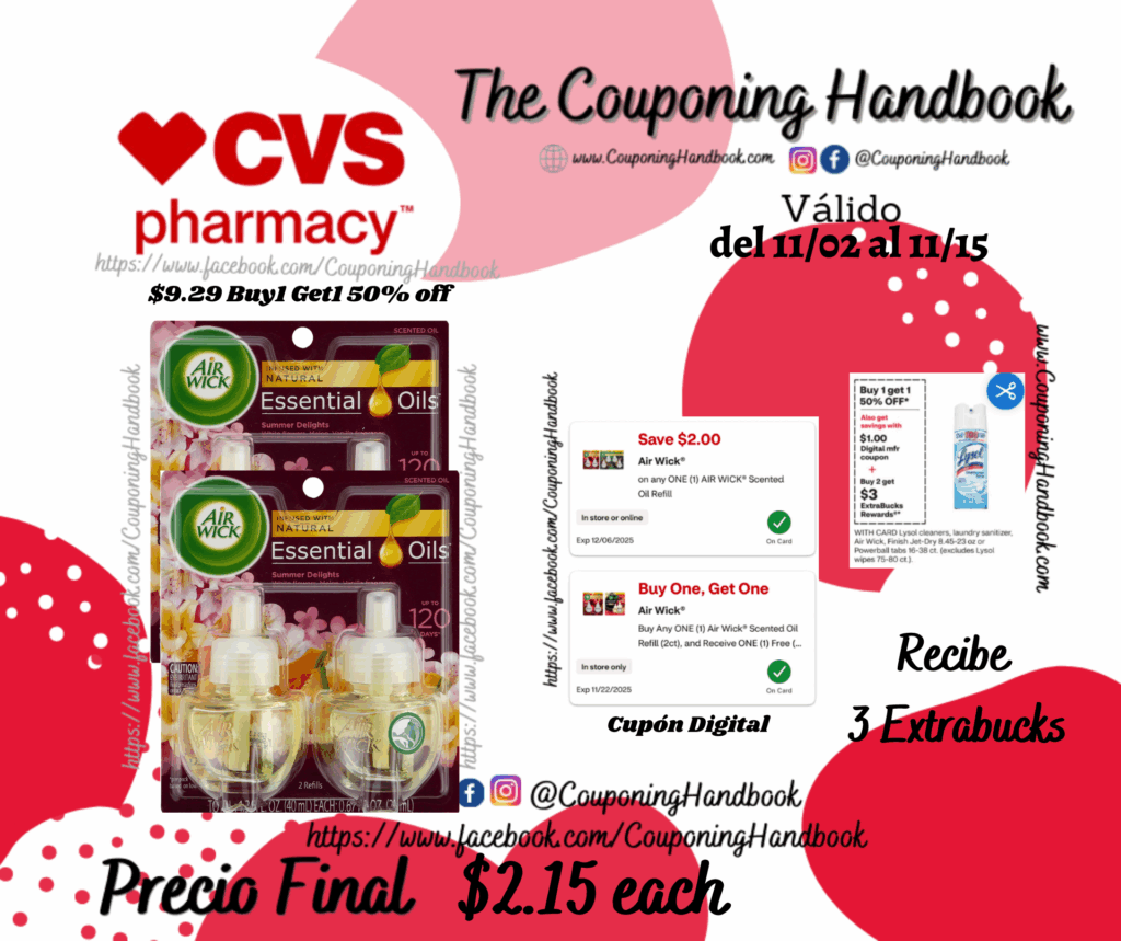Toma 02 Air Wick Scented Oil Twin Refill ($9.29 Buy1 Get1 50% off), clipeamos los cupones digitales de: Buy Any ONE (1) Air Wick® Scented Oil Refill (2ct), and Receive ONE (1) Free (Max Savings Value Up to $7.00)…. y $2/1 any  AIR WICK® Scented Oil Refill…; pagaremos $7.30 pero nos devolverán $3 extrabucks por comprar 02 productos, quedando la compra después de los extrabucks en $2.15 por cada producto.