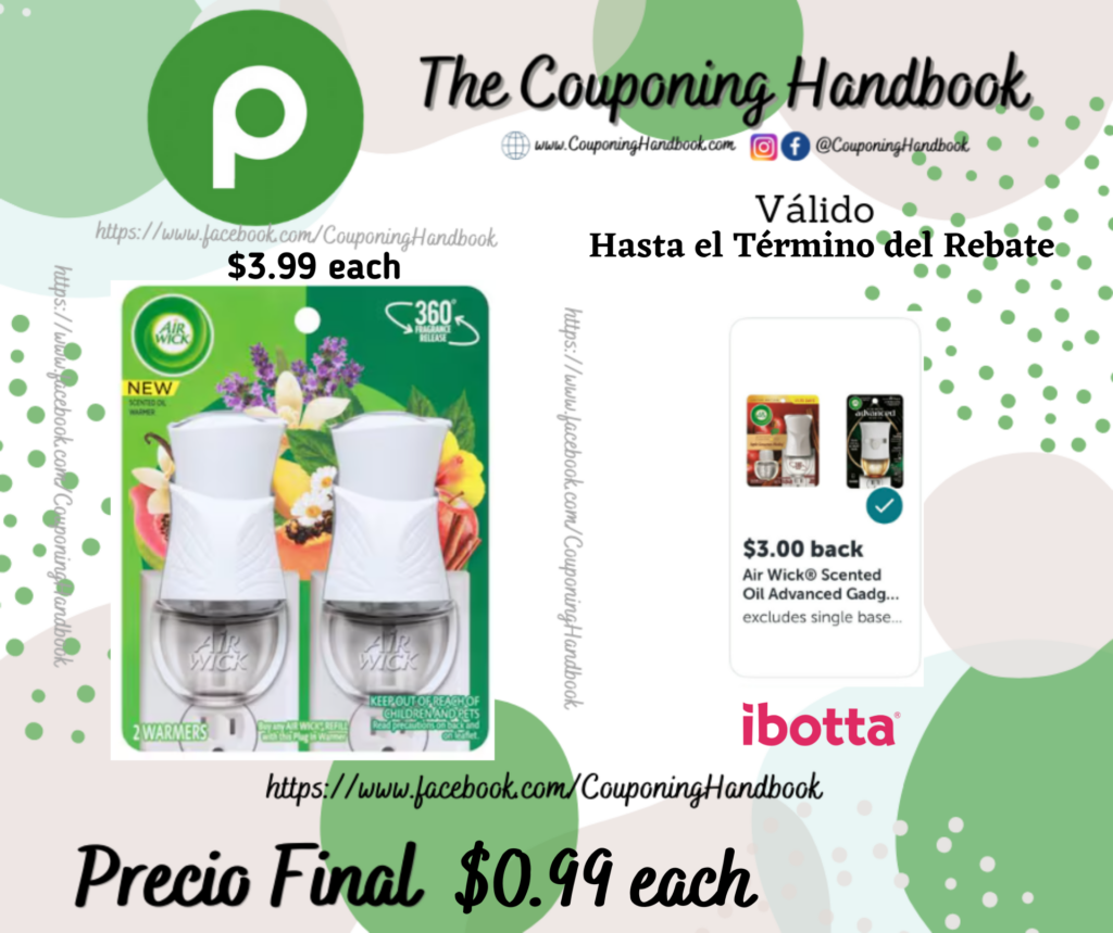 Compra 01 Air Wick Scented Oil Warmer 2 warmers ($3.99 each)….; Pagaremos $3.99 por el producto.