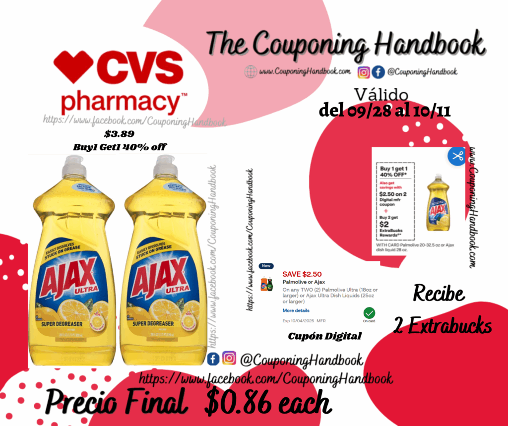 Compra 02 Ajax Super Degreaser Lemon, 28 oz ($3.89 Buy1 Get1 40% off), clipeamos los cupón digital de $2.50/2 any Palmolive Ultra (18oz or larger) or Ajax Ultra Dish Liquids (25oz or larger)….; Pagarás $3.72 pero nos devolverán 02 extrabucks por comprar 02 productos, quedando la compra en $0.86 por cada producto.
