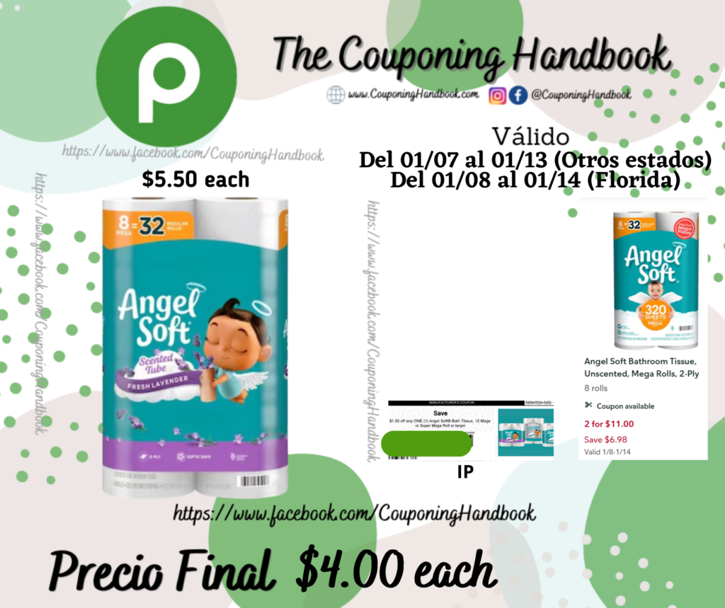 Toma 01 Angel Soft Bathroom Tissue, Fresh Lavender, Scented Tube, Mega Rolls, 2-ply ($5.50 each), entregamos 01 IP de $1.50/1 any angel soft Bounty….el cual lo puedes imprimir suscribiendote en el siguiente enlace