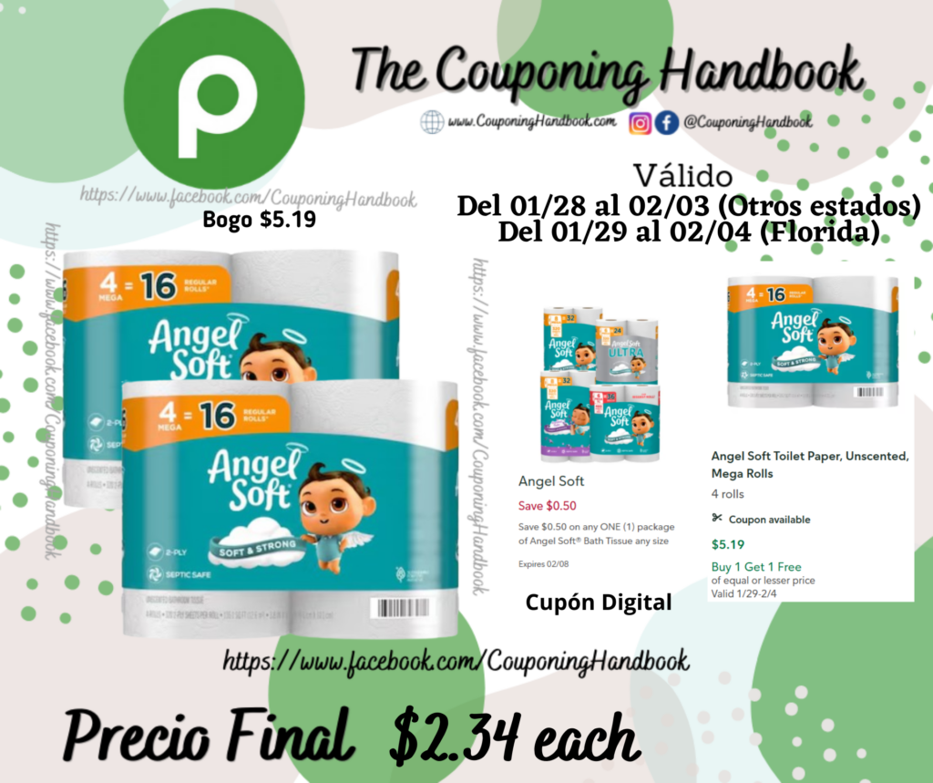 Angel Soft Toilet Paper, Unscented, Mega Rolls 4 rolls por $2.34 por Mery Cardoso el enero 29, 2026 con No hay comentarios Publix Compra 02 Angel Soft Toilet Paper, Unscented, Mega Rolls 4 rolls (Bogo $5.19), clipeamos el cupón digital de $050/1 any package of Angel Soft® Bath Tissue any size…; Pagaremos $2.34 por cada producto. Comparte:FacebookTwitter