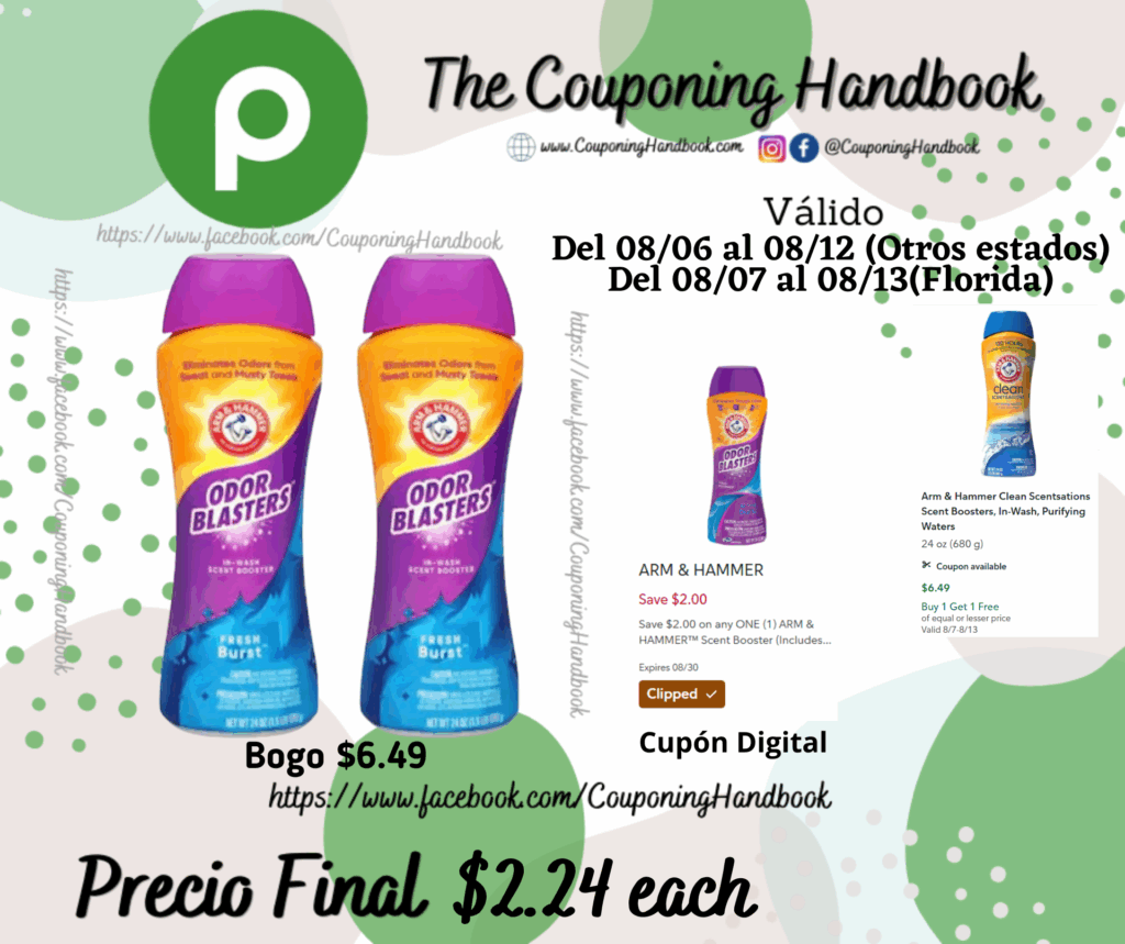 Compra 02 Arm & Hammer Odor Blasters Scent Booster, In-Wash, Fresh Burst 24 oz (Bogo $6.49), clipeamos el cupón digital de $2/1 any ARM & HAMMER™ Scent Booster (Includes 18oz or larger)…..; pagarás $2.24 por cada producto.