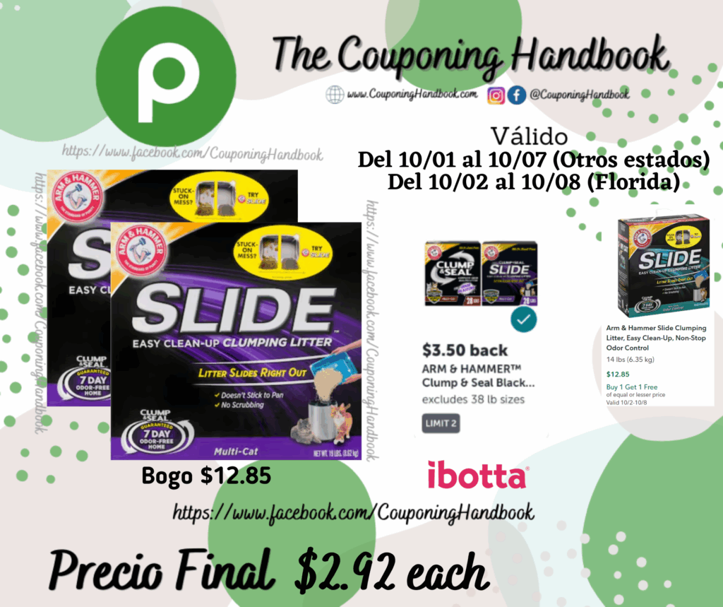 Compra 02 Arm & Hammer Slide Clumping Litter, Multi-Cat (Bogo $12.85)….; pagaremos $12.85 por los 02 productos.