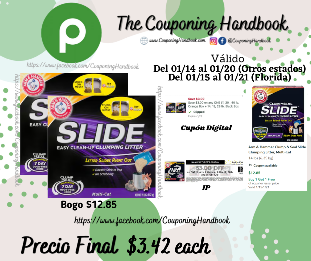 Compra 02 Arm & Hammer Slide Clumping Litter, Multi-Cat (Bogo $12.85), clipeamos el cupón digital de $3/1 any 20, 40 lb. Orange Box + 14, 19, 28 lb. Black Box…., también entregamos un cupón IP de $3/1 any ArmHammer…., el cual lo puedes imprimir en el siguiente enlace