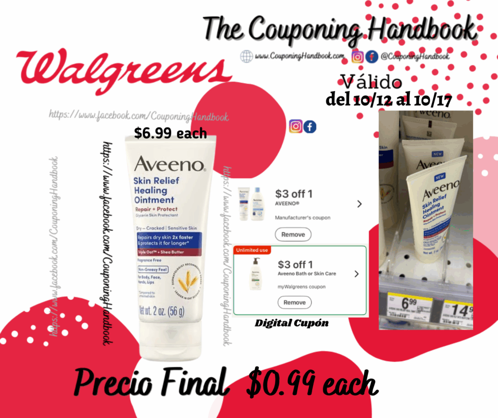 Compra 01 Aveeno Skin Relief Healing Ointment, Fragrance-Free Fragrance-Free, Travel Size, 2.0 oz ($6.99 each), clipea los cupones digitales de: $3/1 aveeno…. y $3 off 1 aveeno bath or skin care (unlimited use)…..; pagarás $0.99 por el producto.
