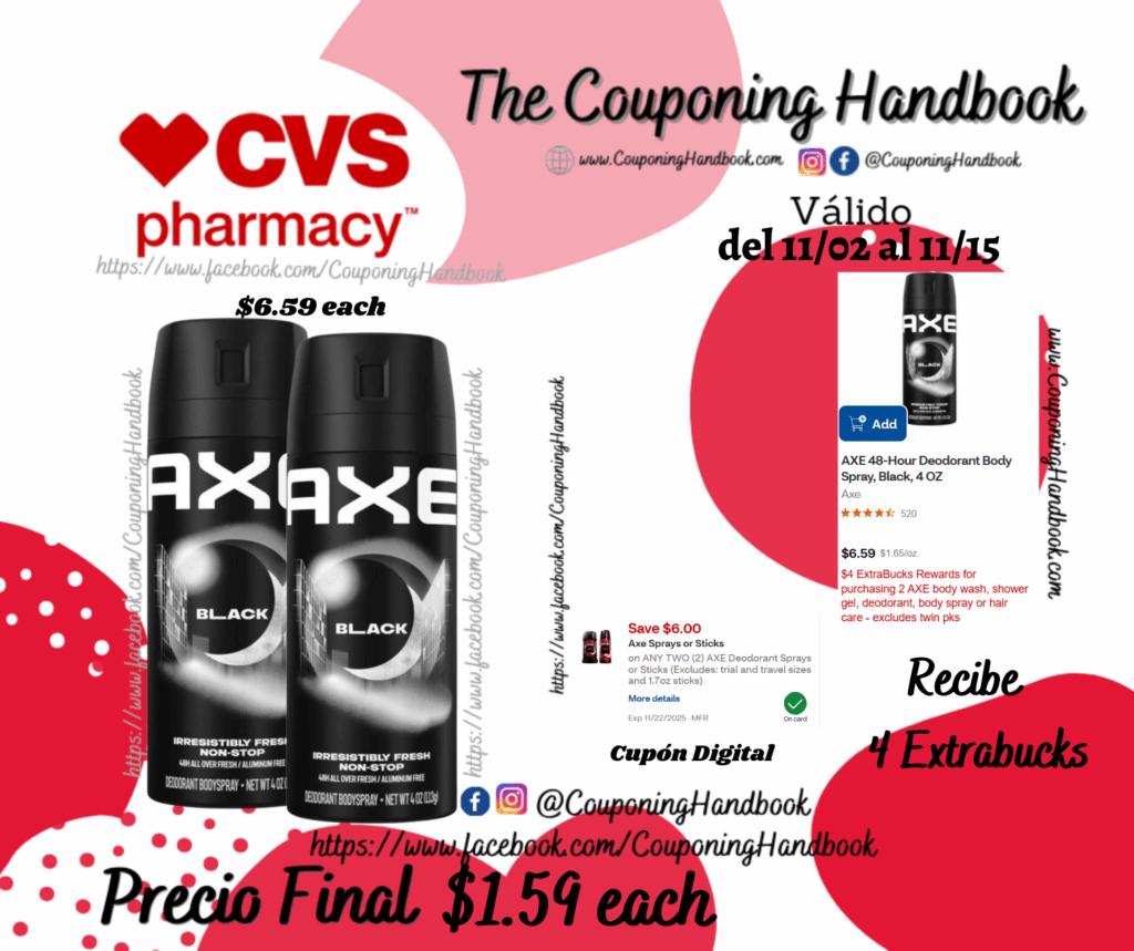 Toma 02 AXE 48-Hour Deodorant Body Spray, Black, 4 OZ ($6.59 each), clipeamos el cupón digital de $6/2 any AXE Deodorant Sprays or Sticks (Excludes: trial and travel sizes and 1.7oz sticks)…; Pagaremos $7.18 pero nos devolverán $4 Extrabucks por comprar 02 productos, quedando nuestra compra después de los extrabucks en $1.59 por cada producto.