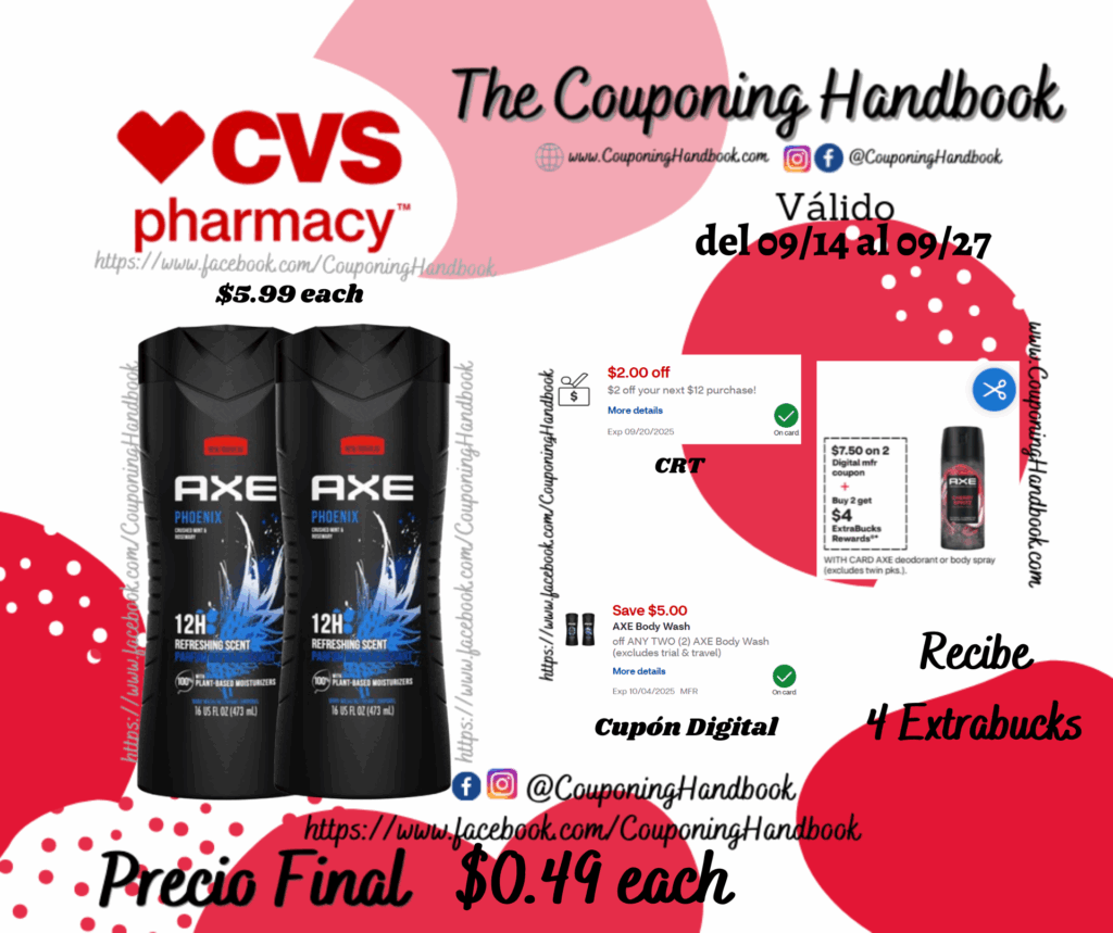 Toma 02 AXE Body Wash for Men, 16 OZ ($5.99 each), clipeamos el CRT de $2 off your next $12 purchase…, también clipeamos el cupón digital de $5/2 any AXE Body Wash……; Pagaremos $4.98 pero nos devolverán $4 Extrabucks por comprar 02 productos, quedando nuestra compra después de los extrabucks en $0.49 por cada producto.
