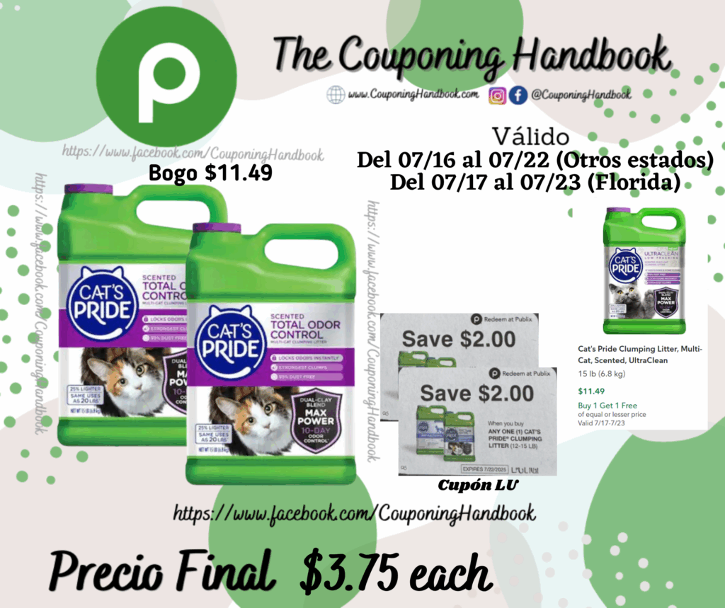 Cat’s Pride Clumping Litter, Multi-Cat, Scented, Total Odor Control por $3.75 por Mery Cardoso el julio 18, 2025 con No hay comentarios Publix Compra 02 Cat’s Pride Clumping Litter, Multi-Cat, Scented, Total Odor Control (Bogo $11.49), recorta 02 cupones LU (Donación) de $1/1 any Cat’s Pride Clumping…..; pagarás $3.75 por cada producto. Comparte:FacebookTwitter