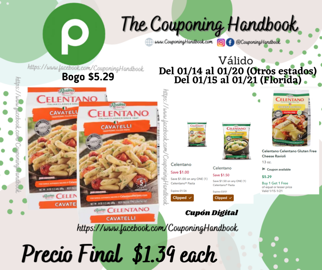 Celentano Cavatelli por $1.39 por Mery Cardoso el enero 15, 2026 con No hay comentarios Publix Compra 02 Celentano Cavatelli (Bogo $5.29), clipeamos los cupones digitales de: $1/1 any Celentano® Pasta…. y $1.50/1 any Celentano® Pasta….; Pagaremos $1.39 por cada producto. Comparte:FacebookTwitter