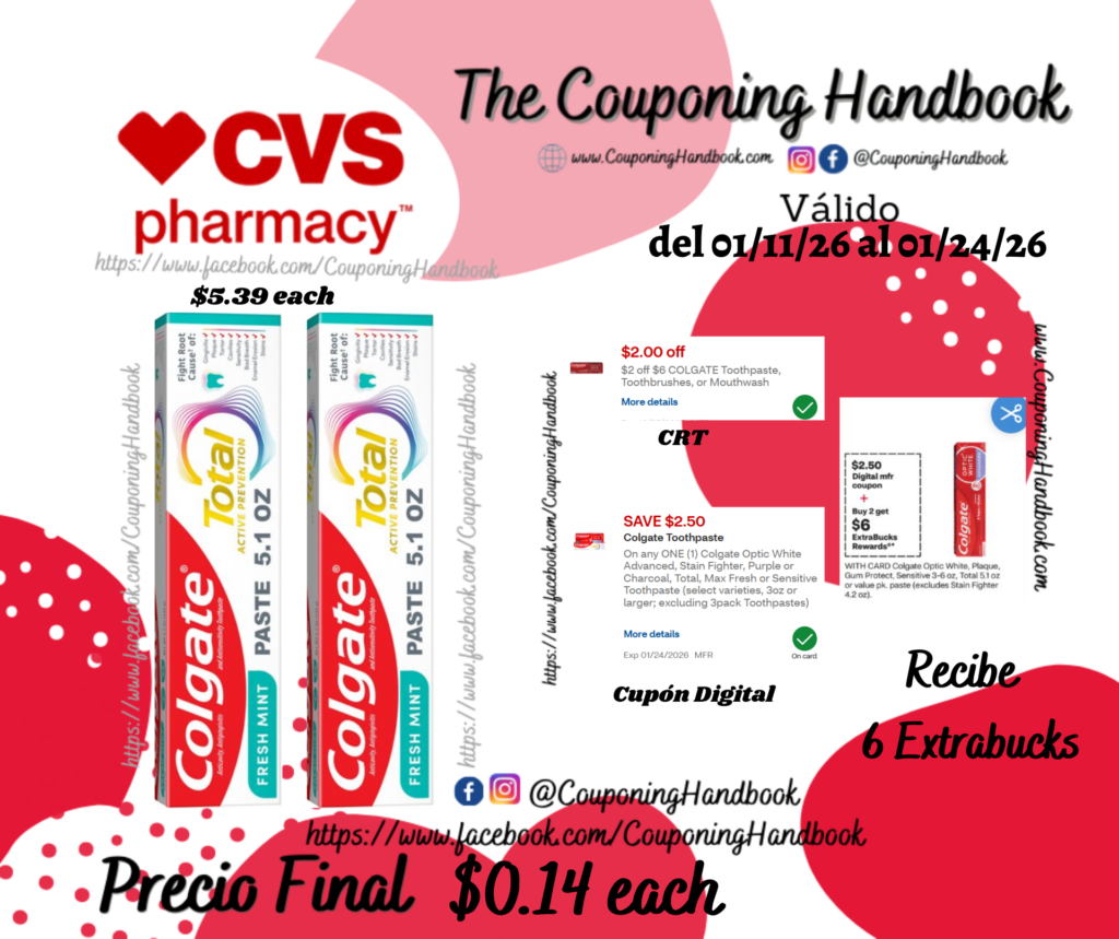 Toma 02 Colgate Total Active Prevention Toothpaste, Fresh Mint, 5.1 OZ ($5.39 each), clipeamos o entregamos el CRT de $2 off $6 colgate toothpaste, toothbrushes…, y por último clipeamos el cupón digital de $2.5/1 any Colgate Optic White Advanced, Stain Fighter, Purple or Charcoal, Total, Max Fresh or Sensitive Toothpaste…..; pagaremos $6.28 pero nos devolverán $6 extrabucks por comprar 2 productos, quedando la compra después de los Extrabucks en $0.14 por cada producto.