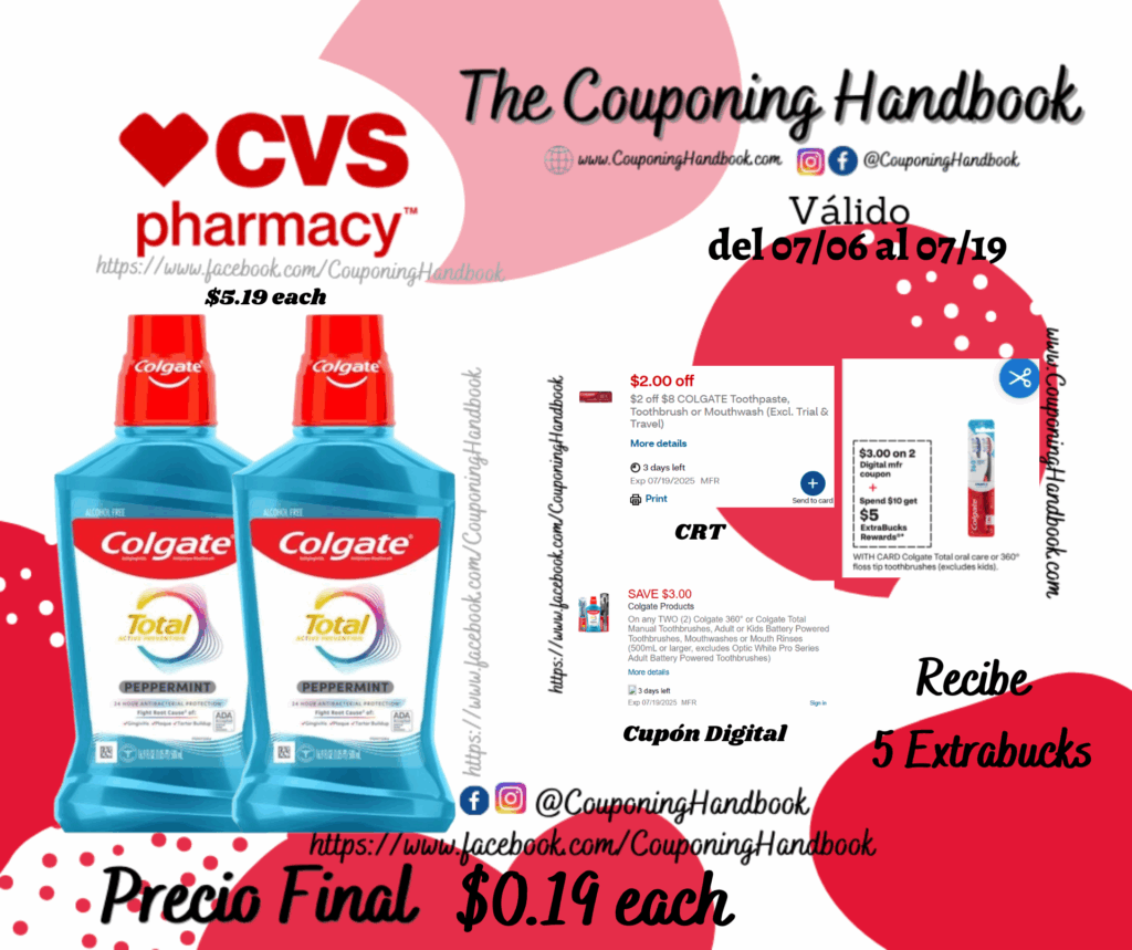 Toma 02 Colgate Total Antigingivitis Antiplaque Mouthwash, Alcohol-Free, Peppermint, 16.9 OZ ($5.19 each), clipeamos el CRT de $2 off $8 COLGATE Toothpaste, Toothbrush or Mouthwash (Excl. Trial & Travel)…., también clipeamos el cupón digital de $3/2 any Colgate 360° or Colgate Total Manual Toothbrushes, Adult or Kids Battery Powered Toothbrushes, Mouthwashes or Mouth Rinses….; Pagarás $5.38 por los 02 productos pero te devolverán $5.00 extrabucks por gastar $10, quedando tu compra en $0.19 por cada producto.