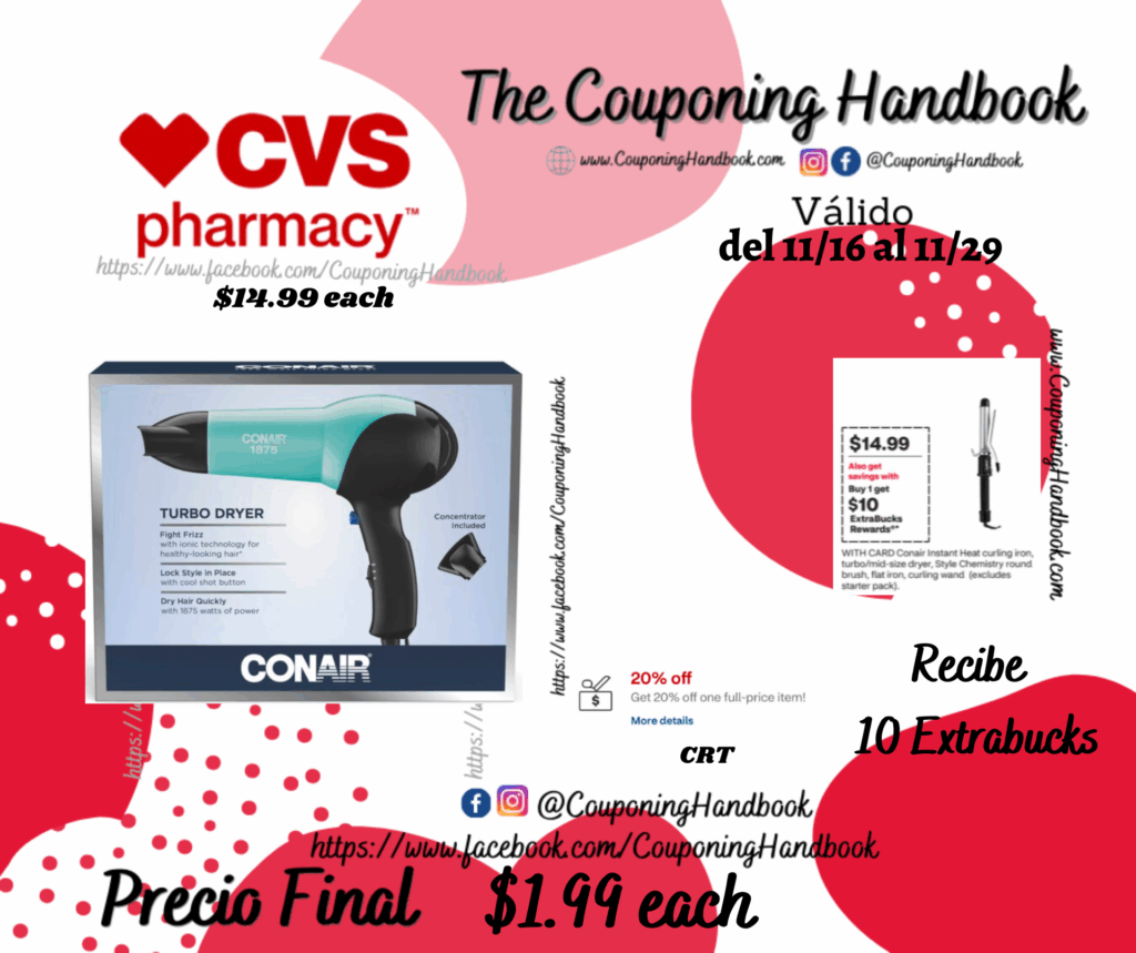 Toma 01 Conair 1875W Turbo Styler Hair Dryer ($14.99 each), clipeamos o entregamos el CRT de Get 20% off one full price item….; pagaremos $11.99 pero nos devolverán $10 Extrabucks, quedando la compra después de los extrabucks en $1.99 por el producto.