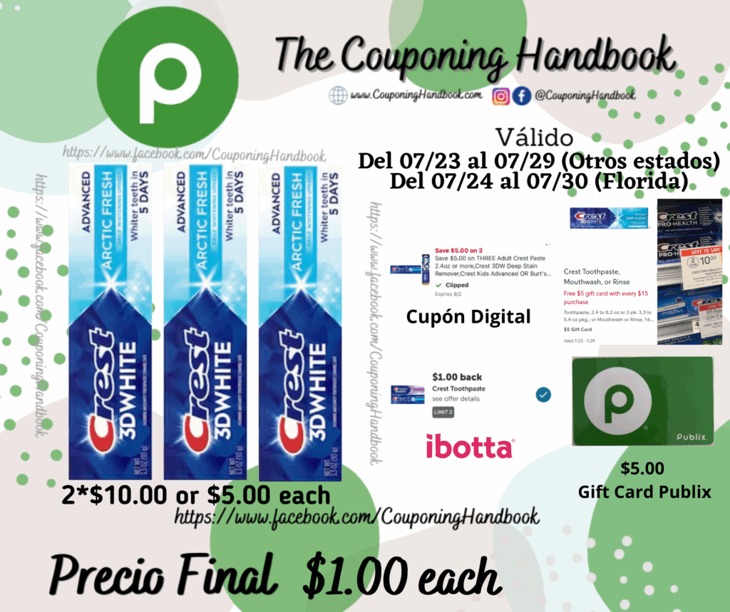 Compra 03 Crest 3D White Toothpaste, Fluoride Anticavity, Advanced, Arctic Fresh 3.3 oz (2*$10 or $5 each), clipeamos el cupón digital de $5/3 Adult Crest Paste 2.4oz or more,Crest 3DW Deep Stain Remover,Crest Kids Advanced OR Burt’s Bees Adult.…; pagarás $10 pero te darán un Gift Card de $5 por la compra de $15.00, quedándote tu compra en $5 por los 03 productos.