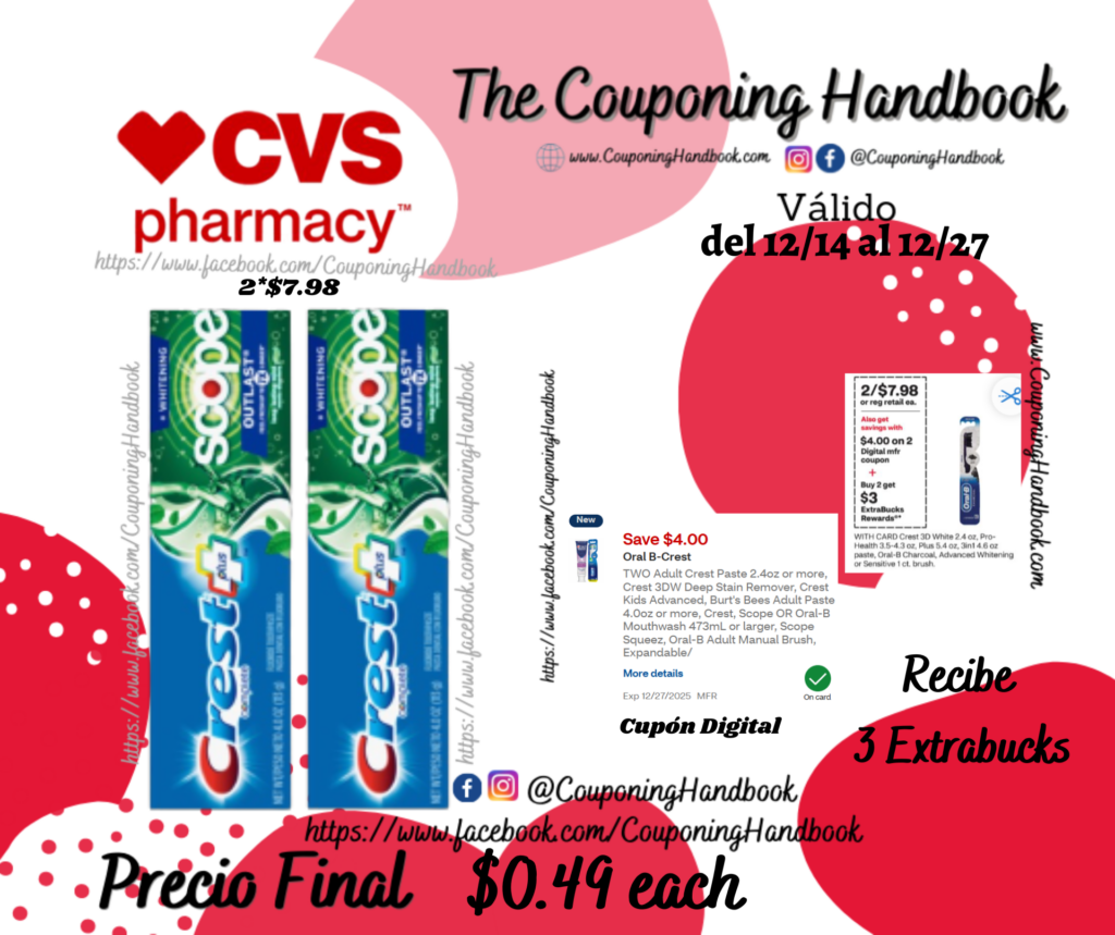 Toma 02 Crest Complete Plus Scope Outlast Whitening Fluoride Toothpaste 5.4 Ounces (2*$7.98), clipeamos el cupón digital de $4/2 Adult Crest Paste 2.4oz or more, Crest 3DW Deep Stain Remover, Crest Kids Advanced, Burt’s Bees Adult Paste 4.0oz or more, Crest, Scope OR Oral-B Mouthwash 473mL or larger ….; Pagarás $3.98 por los 02 productos pero te devolverán $3.00 extrabucks, quedando tu compra después de los extrabucks en $0.49 por cada producto.