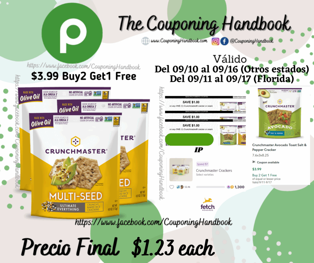 Compra 02 Crunchmaster Cracker ($3.99 Buy2 Get1 Free), entregamos 03 IP de $1.00/1 any crunchmaster cracker or snack, el cual lo puedes imprimir en el siguiente enlace