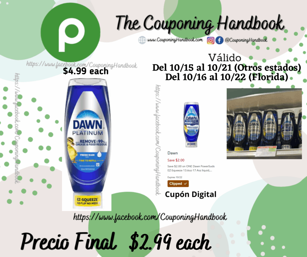 Dawn Platinum EZ-Squeeze Dish Soap, Fresh Rain por $2.99 por Mery Cardoso el octubre 16, 2025 con No hay comentarios Publix Toma 01 Dawn Platinum EZ-Squeeze Dish Soap, Fresh Rain ($4.99 each), clipeamos el cupón digital de $2/1 Dawn PowerSuds EZ-Squeeze 13.6oz-17.4oz liquid, Platinum EZ_Squeeze 18oz-24.3oz OR Ultra EZ-Squeeze….; pagaremos $2.99 por el producto. Comparte:FacebookTwitter