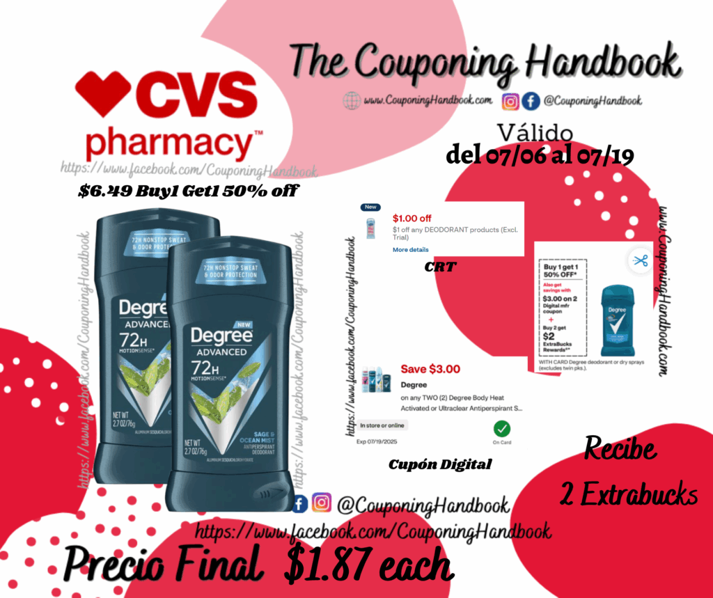 Compra 02 Degree Advanced 72-Hour Antiperspirant & Deodorant Stick, 2.7 OZ ($6.49 Buy1 Get1 50% off), clipeamos el CRT de $1 off any deodorant….., también clipeamos el cupón digital de $3/2 any Degree Body Heat Activated or Ultraclear Antiperspirant…; pagaremos $5.74 pero te devolverán $2 Extrabucks, quedando nuestra compra en $1.89 por cada producto.