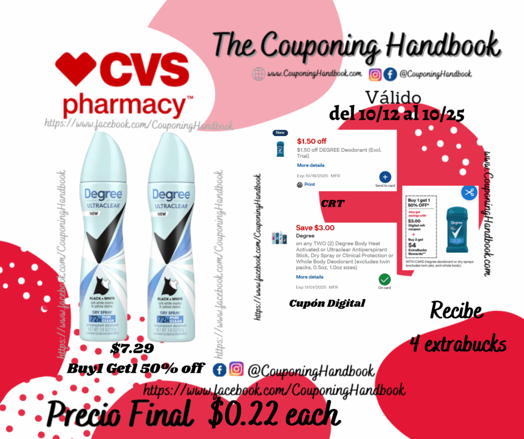 Compra 02 Degree Ultraclear 72-Hour Black + White Antiperspirant & Deodorant Dry Spray, 3.8 OZ ($7.29 Buy1 Get1 50% off), clipeamos el cupón el CRT de $1.50 off DEGREE Deodorant (Excl. Trial)…. también clipeamos el cupón digital de $3/2 any Degree Body Heat Activated or Ultraclear Antiperspirant Stick, Dry Spray or Clinical Protection or Whole Body Deodorant …; pagaremos $6.44 pero nos devolverán $4 Extrabucks por el producto, quedando la compra en $2.44 por ambos productos.
