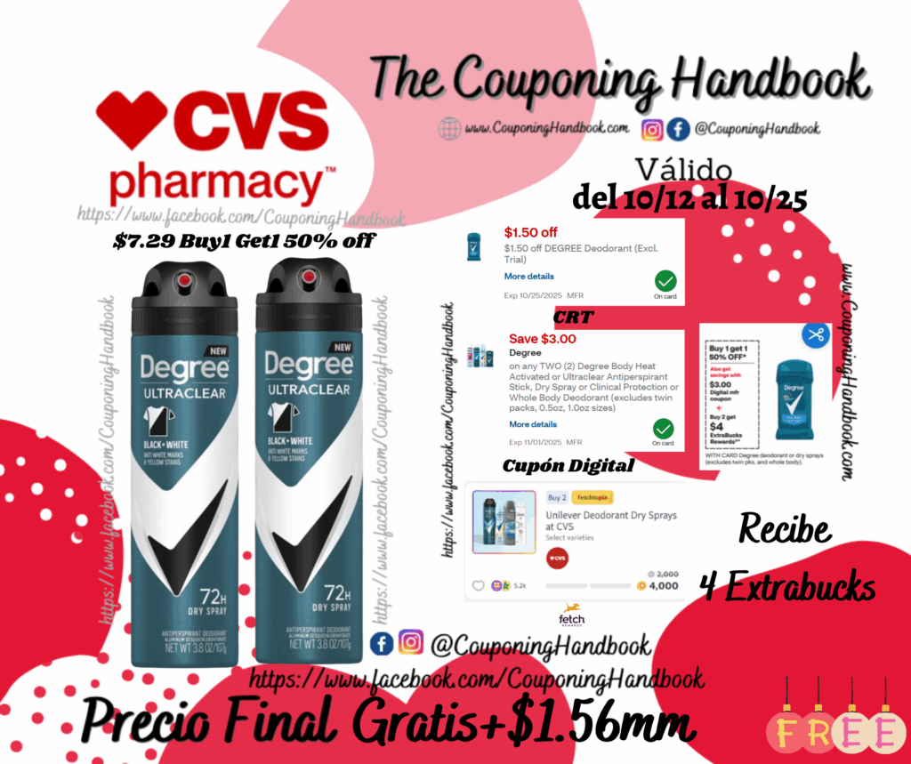 Compra 02 Degree Ultraclear 72-Hour Black + White Antiperspirant & Deodorant Dry Spray, 3.8 OZ ($7.29 Buy1 Get1 50% off), clipeamos el cupón el CRT de $1.50 off DEGREE Deodorant (Excl. Trial)…. también clipeamos el cupón digital de $3/2 any Degree Body Heat Activated or Ultraclear Antiperspirant Stick, Dry Spray or Clinical Protection or Whole Body Deodorant…; pagaremos $6.44 pero nos devolverán $4 Extrabucks por el producto, quedando la compra en $2.44 por ambos productos.