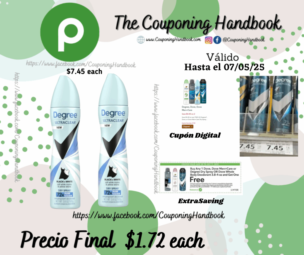 Compra 02 Degree UltraClear Antiperspirant Deodorant, Pure Clean ($7.45 each), clipeamos el cupón digital de $4/2 any Degree, Dove or Dove Men+Care…., por último recortamos un cupón del Libro Extrasaving de Buy1 any Dove, Dove Men+Care or degree…. and Get One Free…..; Pagaremos $3.45 por los 02 productos o $1.72 por cada producto.