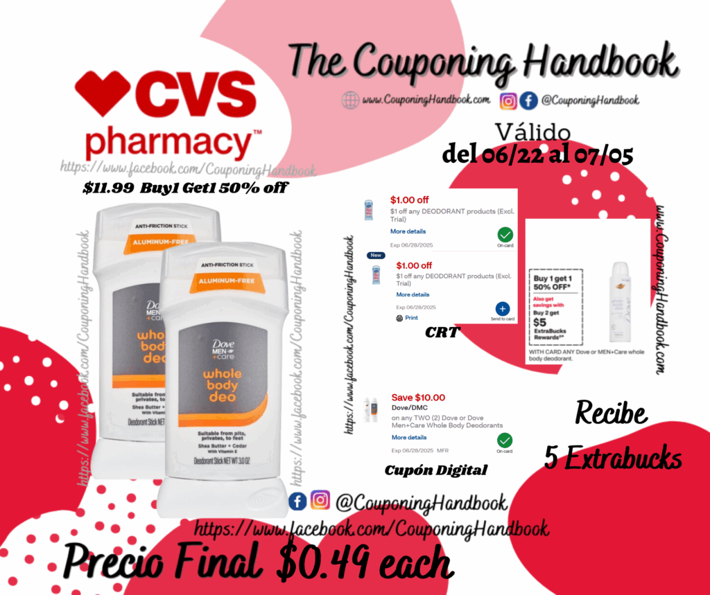Compra 02 Dove Men + Care Whole Body Deodorant Stick, Shea Butter + Cedar, 3 OZ ($11.99 each), clipeamos los (02) CRT de $1 off any deodorant products…., también clipeamos el cupón digital de $10/2 any Dove or Dove+Men Care.…; pagaremos $5.98 pero te devolverán $5 Extrabucks por comprar 2 productos, quedando nuestra compra en $0.49 por cada producto.