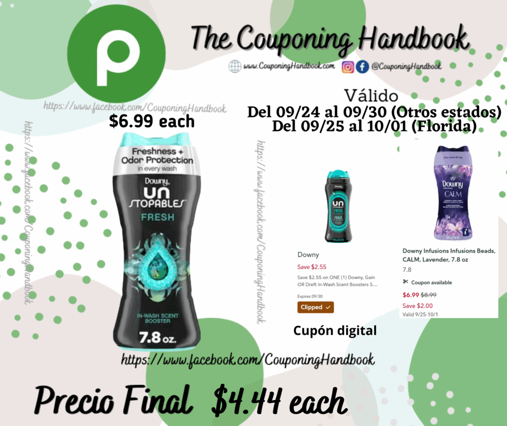 Compra 01 Downy Unstopables/Unstoppables Beads, Fresh, 7.8 oz ($6.99each), clipeamos el cupón digital de $2.55/1 Downy, Gain OR Dreft In-Wash Scent Boosters 5.7 oz or larger (excludes trial/travel size).….; pagarás $4.44 por el producto.
