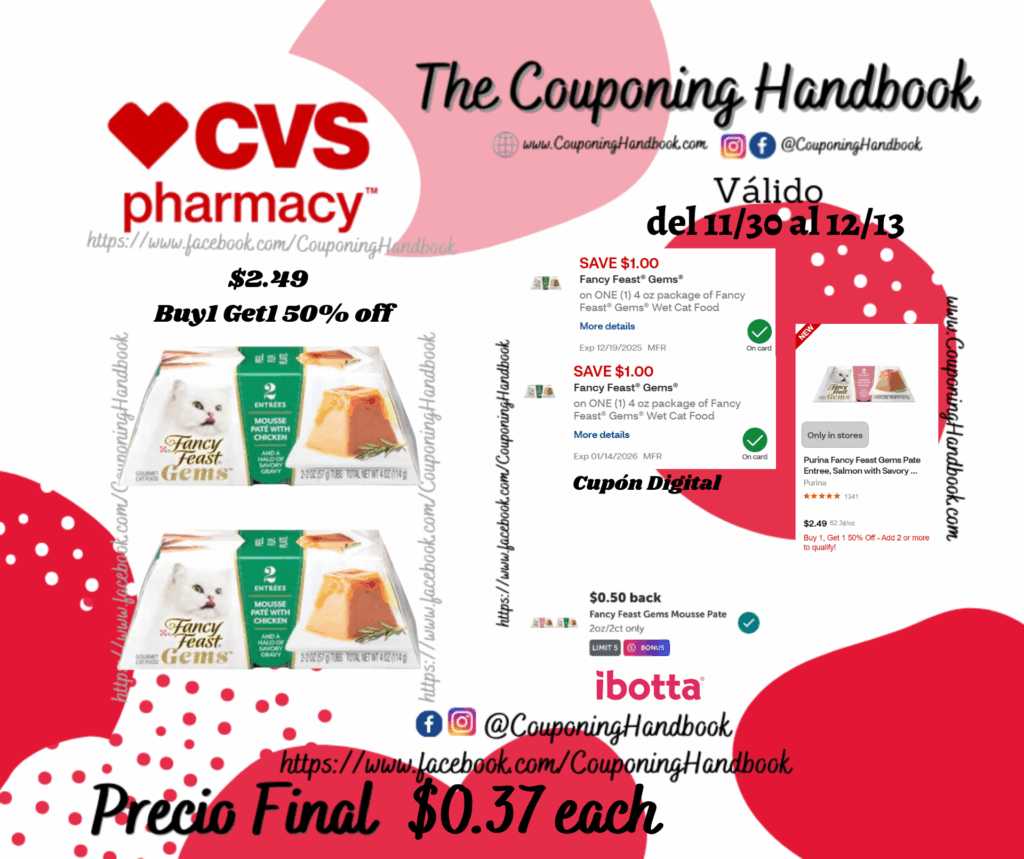 Toma 02 Fancy Feast Gems 2oz/2ct ($2.49 Buy1 Get1 50% off), clipeamos los (02) cupones digitales de $1.00/1 4 oz package of Fancy Feast® Gems® Wet Cat Food….; pagaremos $1.74 por los 02 productos.