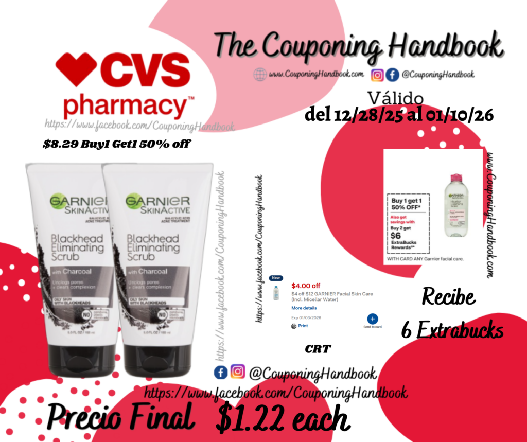 $4 off $12 GARNIER Facial Skin Care (Incl. Micellar Water)…; pagaremos $8.44 pero te devolverán $6 Extrabucks por comprar 2 productos, quedando nuestra compra después de los extrabucks en $1.22 por cada producto.