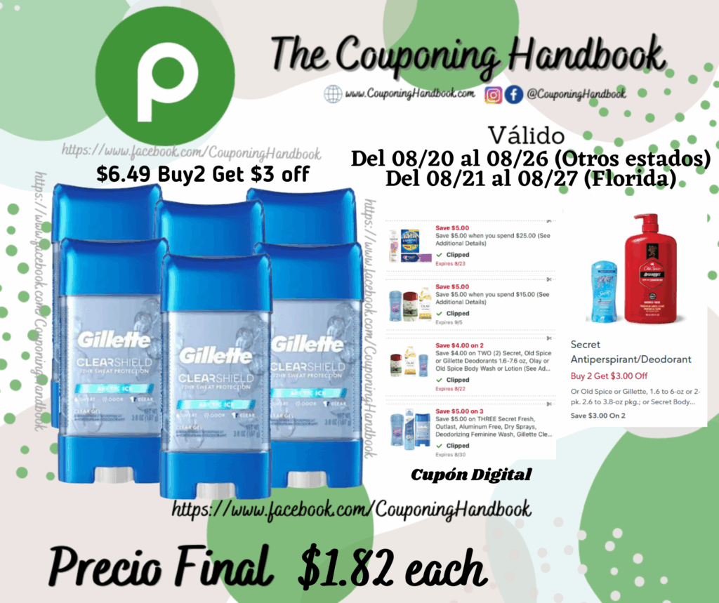 Compra 06 Gillette Antiperspirant/Deodorant, Clear Gel, Arctic Ice ($6.49 each, Buy2 Get $3 off), clipeamos los cupones digitales de: Save $5.00 when you spend $25.00, Save $5.00 when you spend $15.00, $5/3 ecret Fresh, Outlast, Aluminum Free, Dry Sprays, Deodorizing Feminine Wash, Gillette Clear Gel y $4/2 Secret, Old Spice or Gillette Deodorants 1.6-7.6 oz, Olay or Old Spice Body Wash or Lotion….; Pagaremos $10.94 por los 06 productos o $1.82 por cada producto.