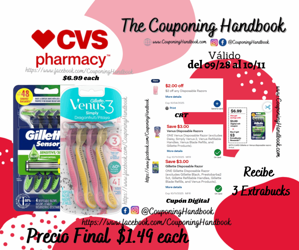 Compra 01 Gillette Sensor3 Sensitive 3-Blade Disposable Razor, 4 CT ($6.99 each) y 01 Gillette Venus Simply 3 3-Blade Disposable Razors, Dragonfruit, 4 CT ($6.99 each), clipeamos el CRT de $2 off any Disposable Razors…, también clipeamos los cupones digitales de: $3/1 Gillette Disposable Razor… y $3/1 Venus Disposable Razor….; Pagarás $5.98 pero nos devolverán $3 extrabucks por comprar 02 productos, quedando la compra después de los extrabucks en $1.49 por cada producto.