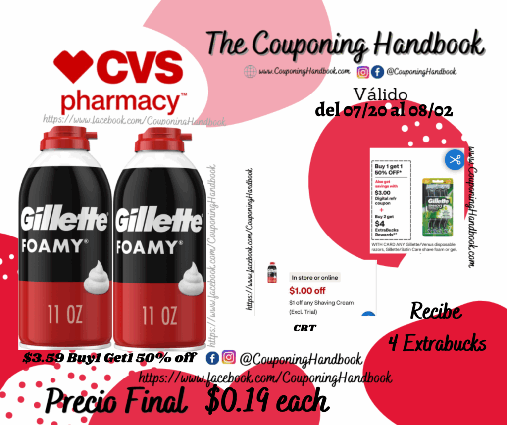 Gillette Foamy Shave Foam por $0.19 por Mery Cardoso el julio 22, 2025 con No hay comentarios CVS Toma 02 Gillette Foamy Shave Foam ($3.59 Buy1 Get1 50% off), clipeamos el CRT de $1 off any shaving cream…; pagaremos $4.38 pero nos devolverán $4 Extrabucks, quedando nuestra compra en $0.19 por cada producto. Comparte:FacebookTwitter