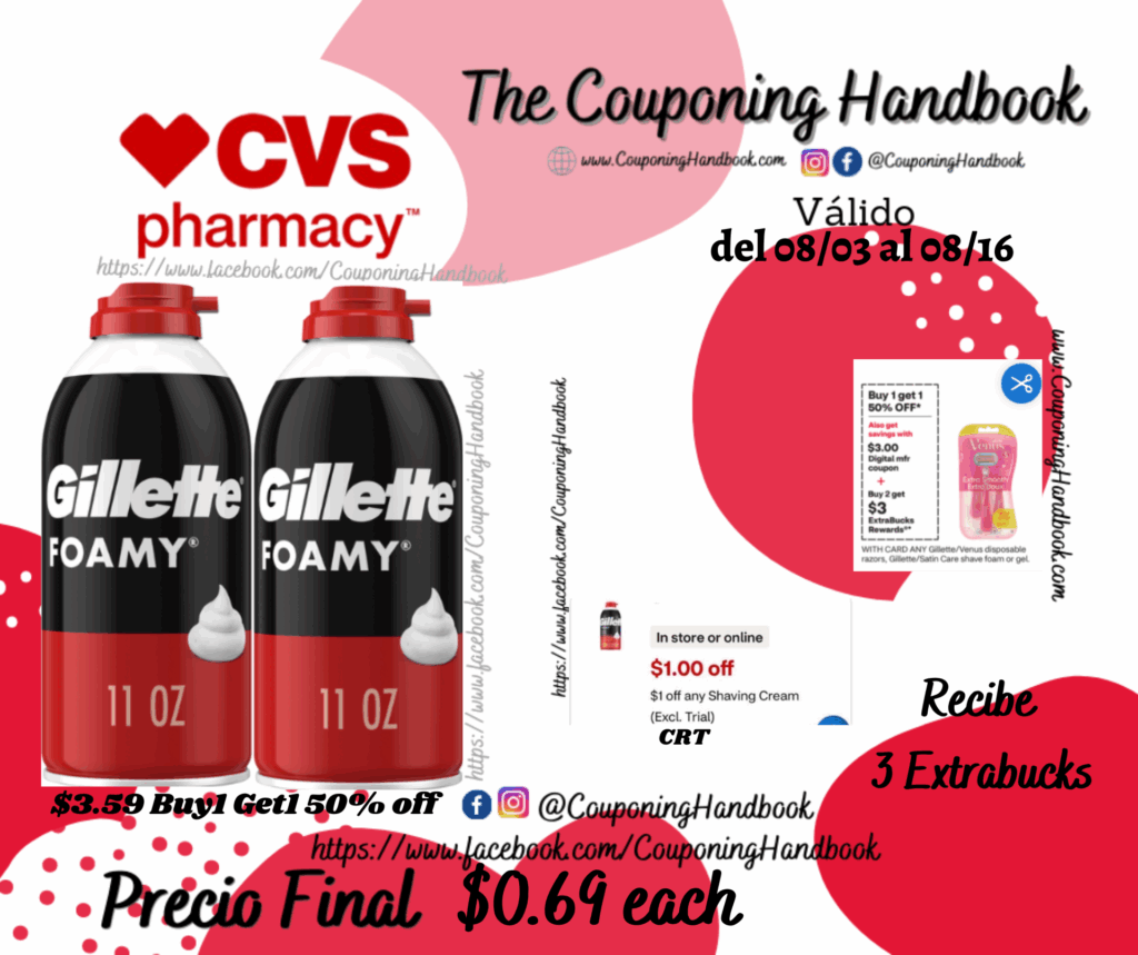 Toma 02 Gillette Foamy Shave Foam ($3.59 Buy1 Get1 50% off), clipeamos el CRT de $1 off any shaving cream…; pagaremos $4.38 pero nos devolverán $3 Extrabucks, quedando nuestra compra en $0.69 por cada producto.
