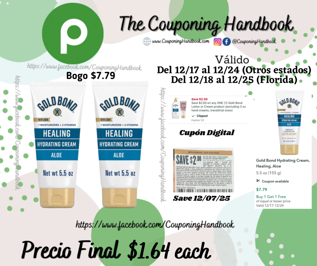 Compra 02 Gold Bond Hydrating Cream, Healing, Aloe 5.5 oz (Bogo $7.79), clipeamos el cupón digital de $2.50/1 any Gold Bond Lotion or Cream product (excluding 3 oz. hand creams, travel/trial sizes)…., también entregamos el cupón del Libro Save del 12/07/25 de $2/1 any goldond lotion….; Pagaremos $1. 64por cada producto.