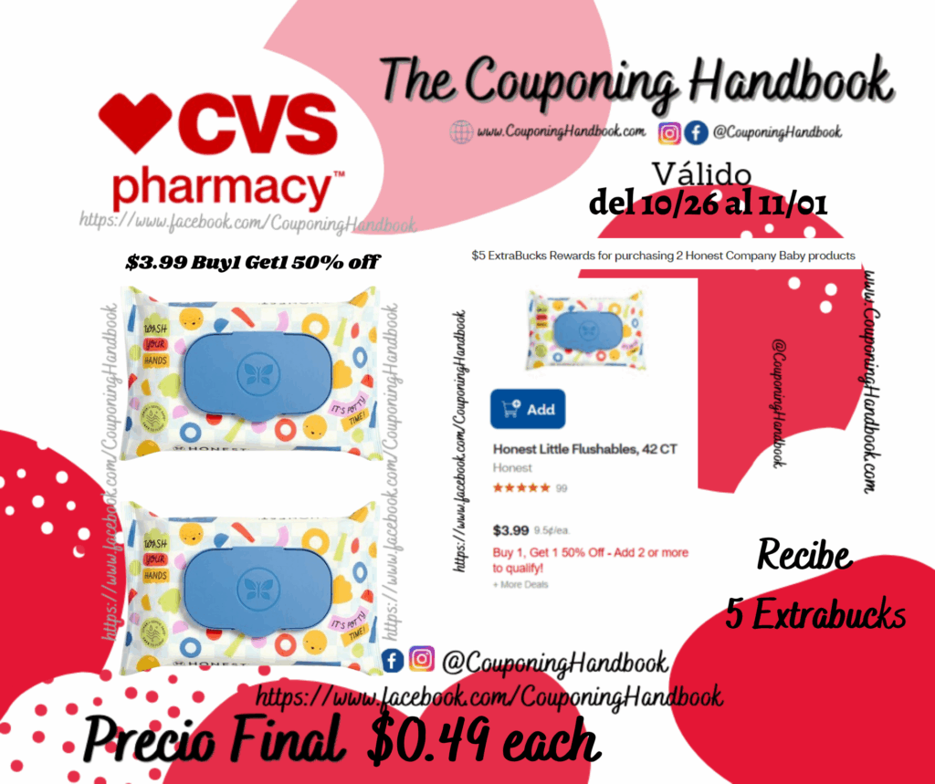 Compra 02 Honest Little Flushables, 42 CT ($3.99 Buy1 Get1 50% off)….; pagaremos $5.98 pero nos devolverán $5 Extrabucks por comprar 02 productos, quedando la compra en $0.49 por cada producto.