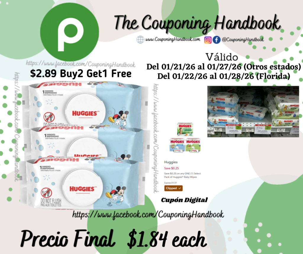 Compra 03 Huggies Simply Clean Wipes, Fresh Scent 64 wipes ($2.89 Buy2 Get 1 Free), clipeamos el cupón digital de $0.25/1 any Pack of Huggies® Baby Wipes, Natural Care®, Simply Clean®, Skin Essentials™, Extra Large, Calm or Nourish (valid only on 42ct. to 168 ct.)….; pagaremos $1.84 por cada producto.